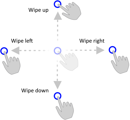The Wipe Touch Handler is optimized to detect one finger wipe gestures. When the user touches the screen and drags the finger vertically or horizontally, the Touch Handler recognizes the movement and sends a signal to one of the slot methods associated to the Handler. Within the slot method your particular implementation is executed. In particular, the Handler can distinguish between a wipe up, down, left and right gesture. The following figure demonstrates the principle idea of a wipe gesture: